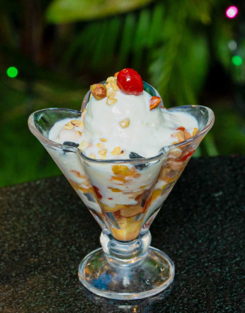 Fruit Salad with 3-in-1 Ice Cream is a delightful dessert combining a medley of fresh, seasonal fruits with a scoop of 3-in-1 ice cream, which typically features a blend of three flavors such as vanilla, pista, and strawberry. The fruit salad adds a refreshing, juicy element, while the ice cream introduces a creamy, indulgent twist. This combination offers a harmonious balance of flavors and textures, making it a delicious and satisfying treat.